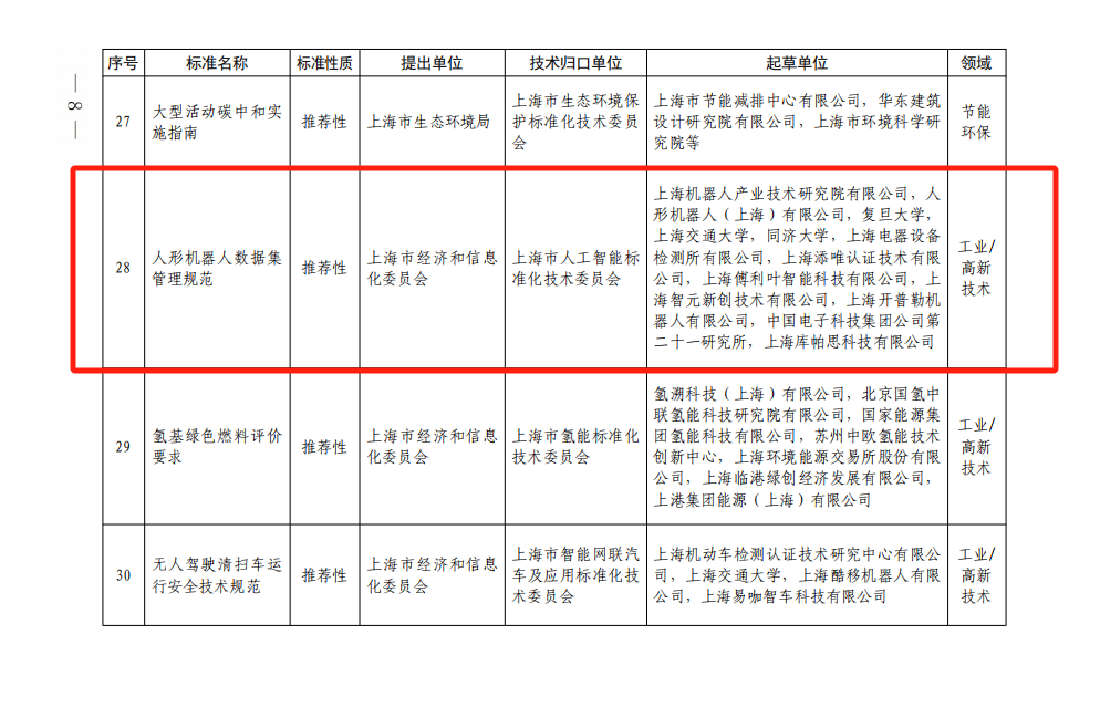 该标准由上海市人工智能标准化技术委员会归口,提出单位为上海市经济和信息化委员会,起草单位由HTH.COM-华体会(中国)机器人有限公司官网有限公司,人形机器人(上海)有限公司等。
