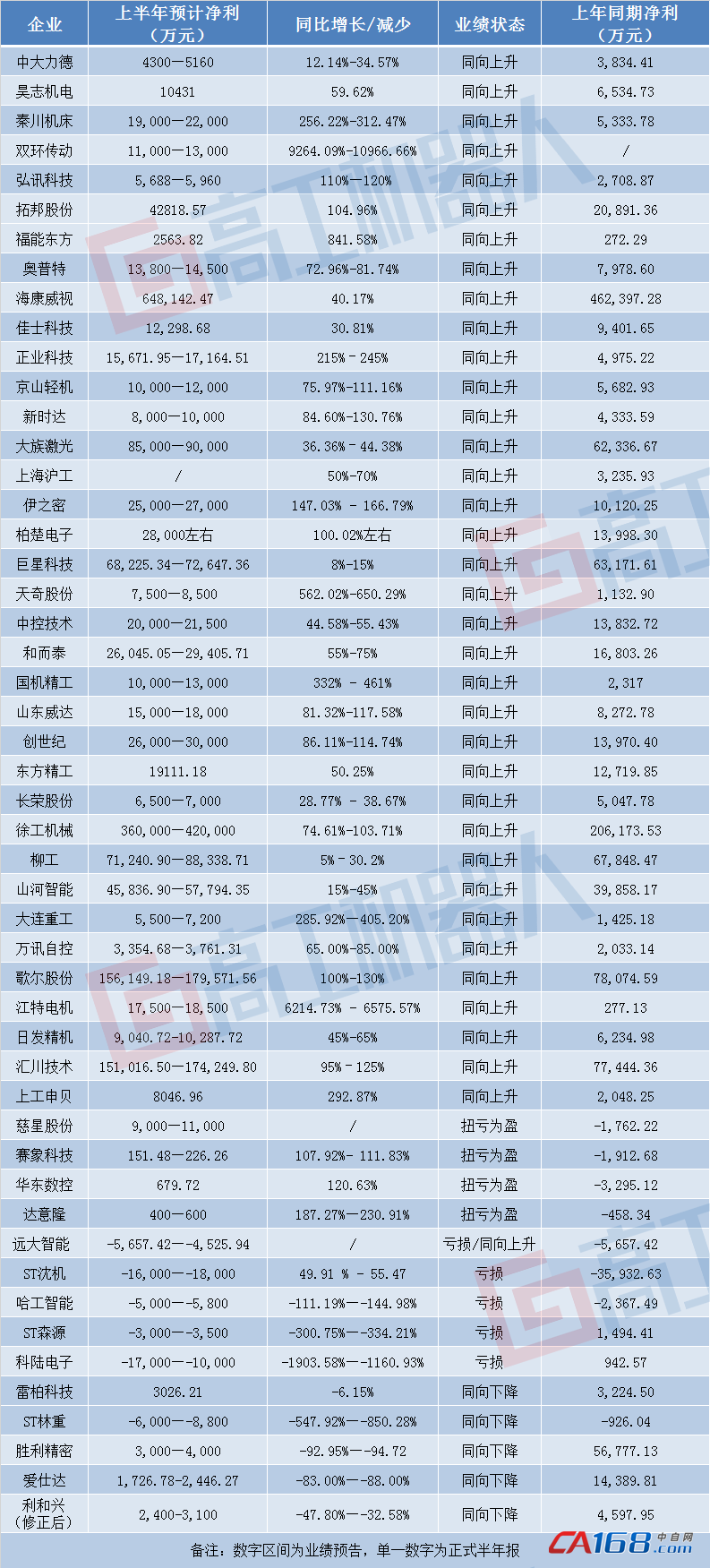 截至8月3日,媒体整理的50份业绩预报显示,有36家企业实现业绩同比上涨,其中有17家企业上半年有望实现净利润同比增长100%以上,而在这当中,正业科技、秦川机床、大连重工、国机精工、天奇股份、福能东方、江特电机、双环传动业绩表现亮眼,其净利润分别同比大增215%、256.22%、285.92%、332%、562.02%、841.58%、6214.73%、9264.09%,但值得注意的是,这些上市公司中,机器人相关业务所占的比重都不算高。华东数控、达意隆、慈星股份、赛象科技等4家企业有望实现扭亏为盈。